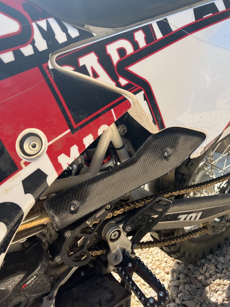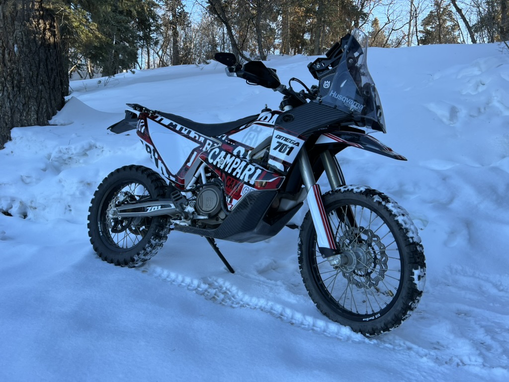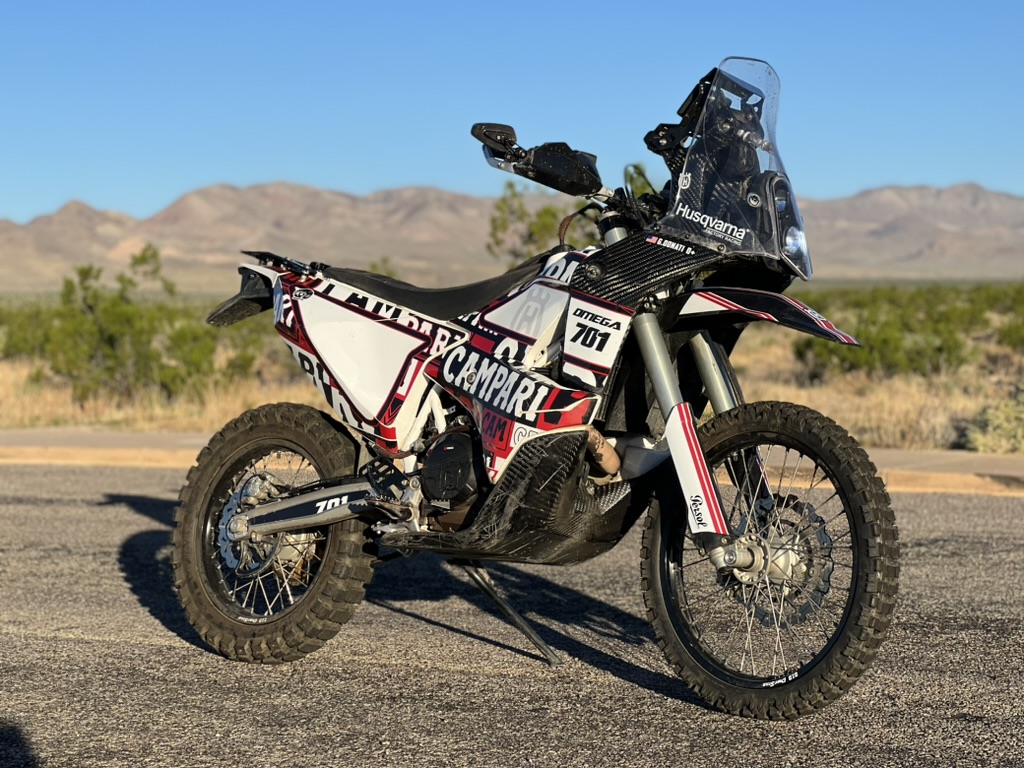 When I bought the 701 it already had an Omega Fiber Gen 1 Rally Kit installed from South Africa. The Omega kit is based off of the earlier KTM/Husky dakar kits of this chassis but made for privateers to race. The Omega kit adds 34lbs through a wind screen, rally tower, two front gas tanks and skid plate, providing aerodynamics and an additional 4 gallons of fuel putting the bike right around 400lbs. With a hair over 7gallons of fuel it can do about 300-350miles on the 3 tanks and is insanely capable with WP 48mm forks and WP shock in the rear. Also installed were Yoshimura Exhaust and the Rottweiler emissions delete and intake packages.