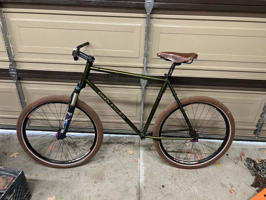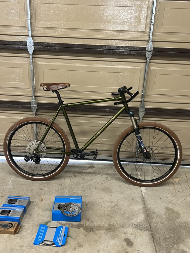 Quickly evolving into a Drop Bar MTB with a converted modern Shimano Deore 1×11 Drivetrain. Minimum front fork travel is 90mm, max is 130mm, I plan on tearing the fork apart and removing 1″ of travel for this application by adding a spacer into the stack.