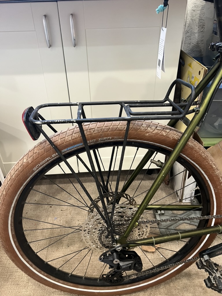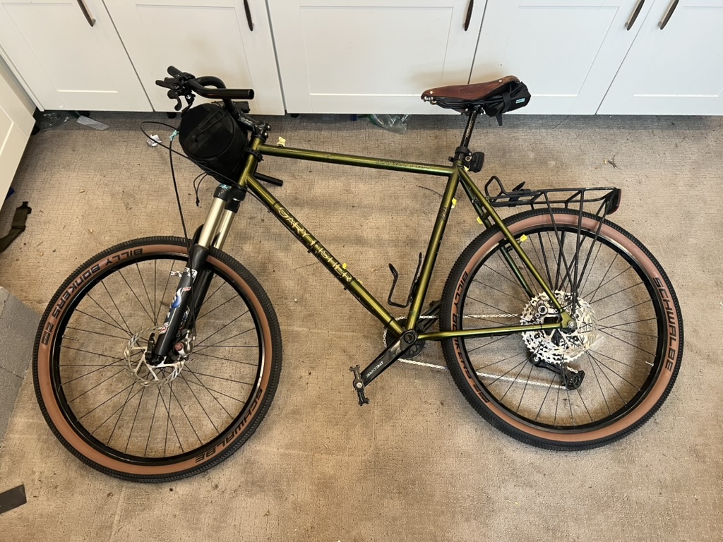 Handlebar bag and wheel swapout with my wife’s unridden 26″r. Hope Pro Evo 2 hubs, which make the greatest noise. The General layout and Idea was created.